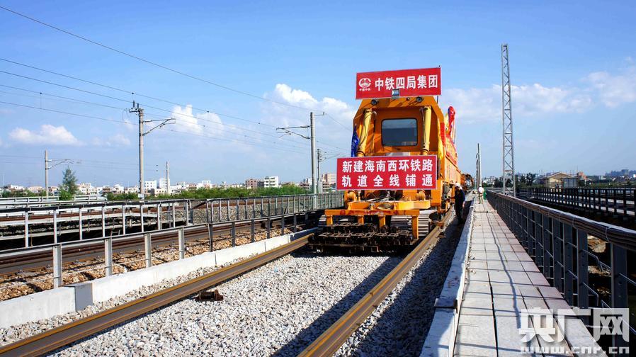 央廣網(wǎng)海口6月30日消息(記者許云 吳媚苗)6月30號下午18時(shí)整,伴隨著鋪軌車作業(yè)的轟隆聲,鐵路工人們將海南西環(huán)鐵路上最后一根長鋼軌在?诨疖囌靖浇佅隆V链,正線全長345公里的海南西環(huán)鐵路正式完成鋪軌!靶陆êD衔鳝h(huán)鐵路鋪軌工程全線雙線鋪通!”——廣鐵集團(tuán)?诠こ探ㄔO(shè)指揮部副指揮長林鎮(zhèn)洪用響亮的聲音宣布道。