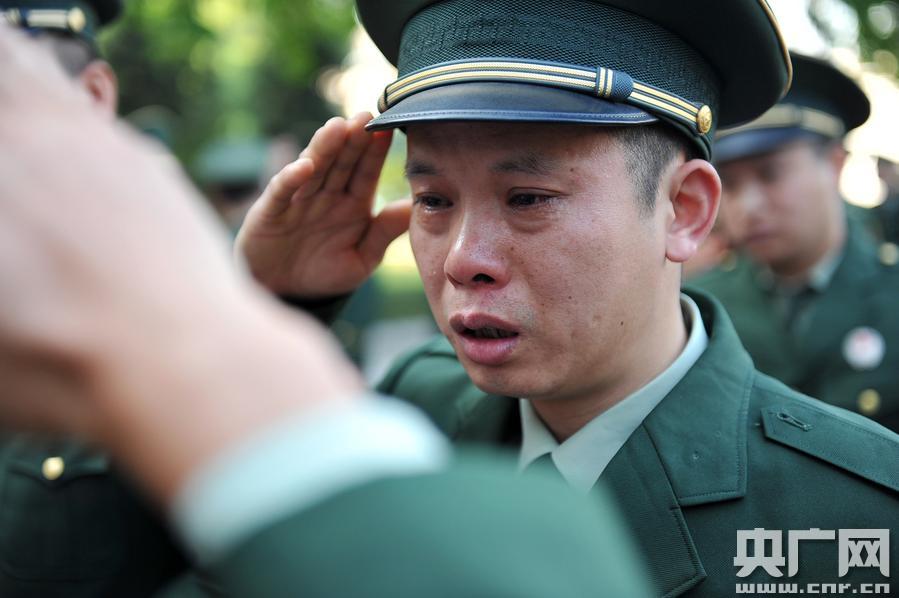 在當(dāng)天的退伍儀式上,當(dāng)部隊(duì)首長(zhǎng)宣讀退出現(xiàn)役命令時(shí),每名退伍老兵都用鏗鏘有力的聲音回應(yīng)著軍營(yíng)里的最后一次點(diǎn)名,當(dāng)戰(zhàn)友為他們卸下警銜、摘下帽徽的時(shí)候,老兵們流下了不舍的淚水。