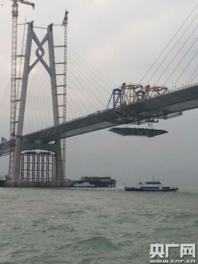 央廣網(wǎng)廣州4月12日消息(記者周羽 通訊員 成寶剛)4月11日20時(shí),舉世矚目的港珠澳大橋建設(shè)又有新進(jìn)展——港珠澳大橋主橋最大跨徑青洲航道橋最后一片鋼箱梁完成吊裝順利“合龍”。