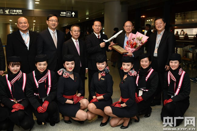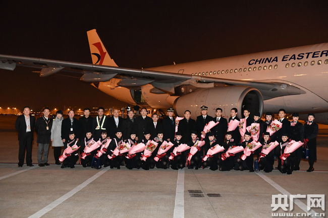 東航領(lǐng)導(dǎo)在虹橋機(jī)場迎接機(jī)組,共同慶祝實(shí)現(xiàn)2016航空安全年