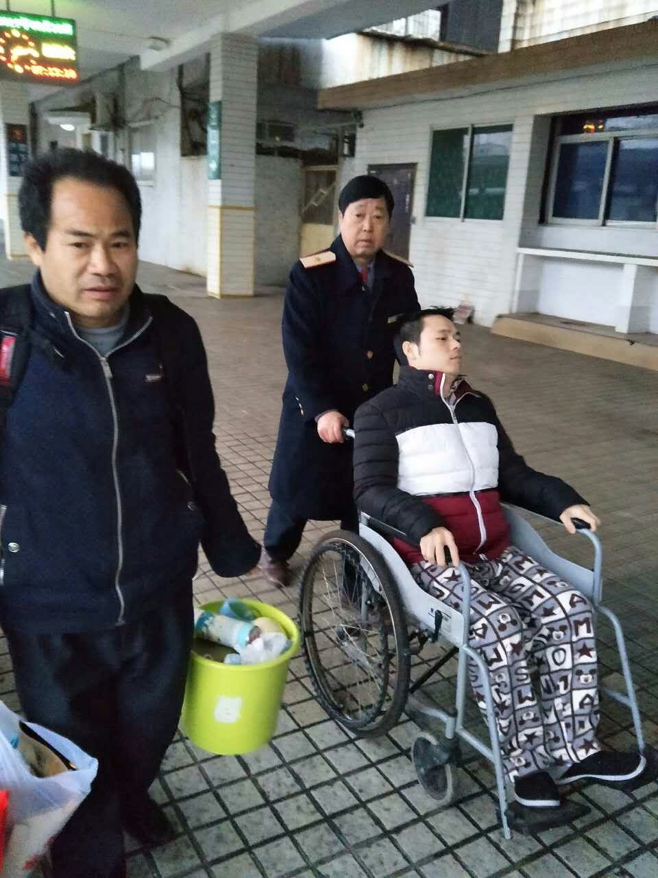 3月19日5:16分,K1557次準點?吭撜径九_,客運員李建生按照旅客提供的信息,上到9號車廂,找到屈貴良和屈毅星父子,將屈毅星背下車廂,并迅速地將殘疾人輪椅打開,李建生和他的父親將屈毅星扶上輪椅,沿著規(guī)劃的路線,從二站臺推著該旅客從行包地道上下,轉到一站臺從無障礙出口出站。
