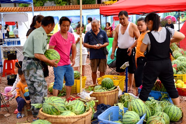 央廣網(wǎng)永州6月12日消息(記者堯遙 通訊員李先志 梁余強 李志英)6月10日,湖南省永州市藍(lán)山縣土市鎮(zhèn)泉塘村舉辦了首屆“西瓜節(jié)”,活動吸引了周邊市縣的數(shù)千名群眾和客商。村支書程柳青介紹,當(dāng)天全村西瓜均價1.5元每斤,成交量約15萬斤。坐在家門口當(dāng)老板的瓜農(nóng),個個喜笑顏開。