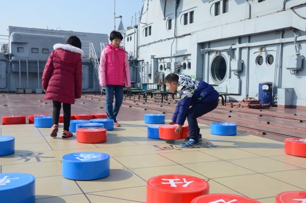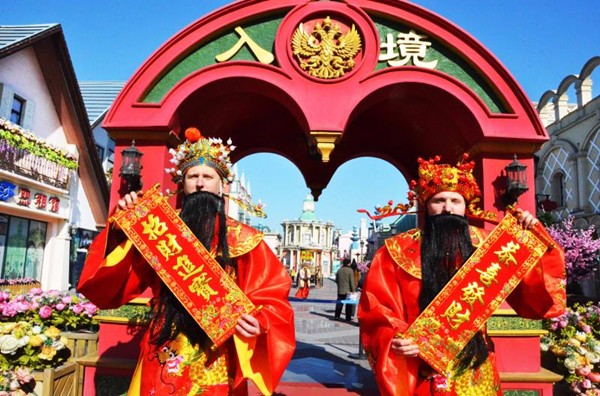 除了濃郁的軍事特色,中西合璧的混搭風(fēng)情也成為航母游的一大看點(diǎn)。公園工作人員介紹,今年公園推出的“洋”財(cái)神爺同樣聚集了不少人氣。俄羅斯姑娘和小伙在歡快的音樂(lè)伴奏下翩翩起舞,為游客們送上了獨(dú)特的新春祝福。