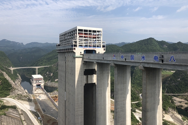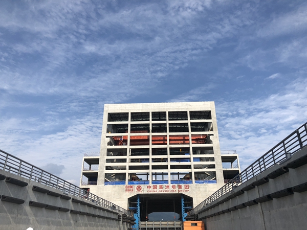 構(gòu)皮灘水電站副廠長(zhǎng)、總工程師王貴來介紹,根據(jù)構(gòu)皮灘水電站通航工程的技術(shù)特點(diǎn)、自然條件和建設(shè)要求,該通航工程采用三級(jí)垂直升船機(jī),第一、三級(jí)采用船廂下水式垂直升船機(jī),第二級(jí)采用全平衡式垂直升船機(jī)!耙?yàn)槲覀兊淖罡咄ê剿^達(dá)到199米,如果采用船閘的方式通航,最低需要采用七級(jí)船閘,一艘貨船單單在構(gòu)皮灘通航就需要耗費(fèi)很長(zhǎng)時(shí)間。但是現(xiàn)在采用垂直升船機(jī),通過2306米的航道,我們?cè)O(shè)計(jì)的單向通航時(shí)間只有38分鐘!