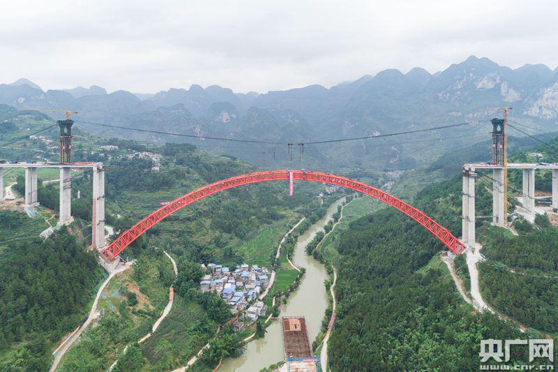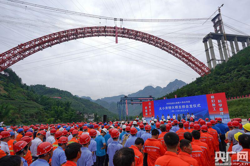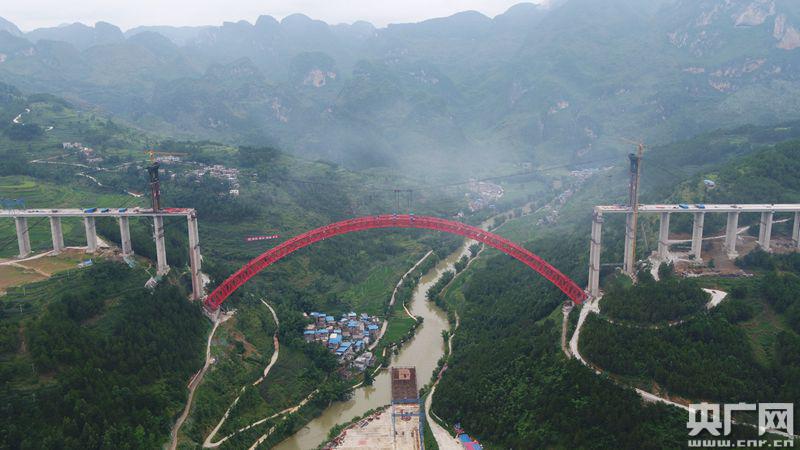 央廣網(wǎng)貴陽7月1日消息(記者張兆福)昨天上午,貴州黔南州平塘到羅甸高速公路大小井特大橋傳來捷報,隨著最后一節(jié)鋼管吊裝安裝就位,世界最大跨徑上承式鋼管混凝土拱橋主拱圈順利合龍。這標(biāo)志著“世界橋梁博物館”的貴州再次刷新世界記錄,又添一座世界級橋梁。大小井特大橋?qū)Φ、桂、黔石漠化集中連片特困地區(qū)的脫貧攻堅有重要推動意義。