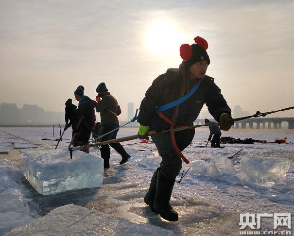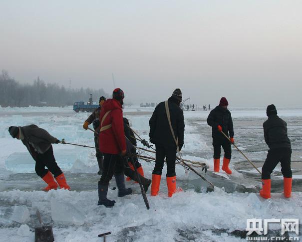 取冰人正在將冰塊從江面拖拽出來,這樣一份工作一天的工資有300塊錢,冰雪旅游讓以前“貓冬”的東北人也忙了起來。央廣網(wǎng)記者 遲嵩攝