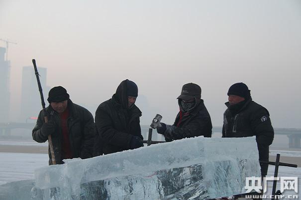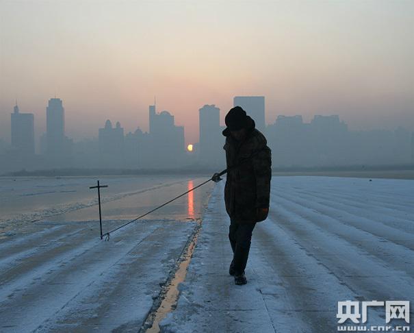 早晨6點37分,天剛蒙蒙亮,取冰人已經(jīng)在零下21度的江面上開始一天的工作。央廣網(wǎng)見習(xí)記者 唐國榮攝