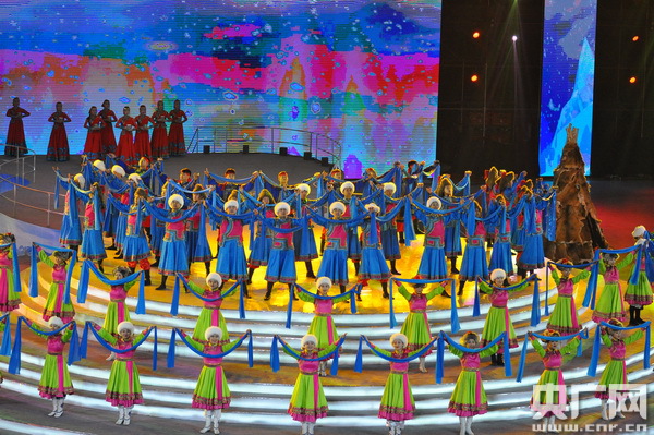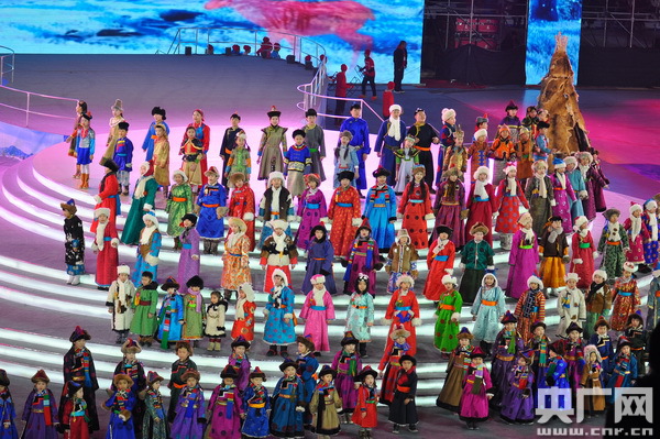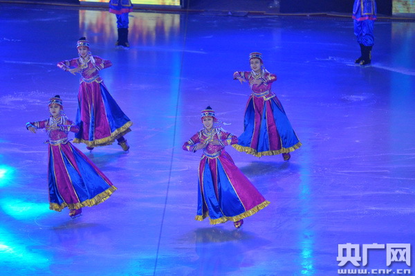 開(kāi)幕式表演以“相約呼倫貝爾”為主題,分為“冰雪燃情”“冰雪逐夢(mèng)”“冰雪之約”三個(gè)篇章。隨著序曲《牧歌》的悠揚(yáng)響起,壯美的呼倫貝爾大草原張開(kāi)雙臂,歡迎全區(qū)冰雪運(yùn)動(dòng)健兒和四海朋友的到來(lái)!都轫灐贰稓g樂(lè)那達(dá)慕》等冰上舞蹈表演展現(xiàn)了草原民族傳統(tǒng)文化與現(xiàn)代冰雪運(yùn)動(dòng)激情碰撞的“冰雪奇緣”,讓冬日的草原充滿生機(jī)與活力。呼倫貝爾大草原上的天籟之音——五彩呼倫貝爾兒童合唱團(tuán)的小朋友們演唱了《三少民族聯(lián)歌》,歡快的旋律描繪出各族人民其樂(lè)融融生活在一起的和諧畫面;伴隨著《讓生命遠(yuǎn)航》激情豪邁的歌聲,速滑、冰球運(yùn)動(dòng)員精神抖擻地滑行入場(chǎng),激情豪邁的歌聲和活力四射的速滑表演將開(kāi)幕式推向高潮。一曲氣勢(shì)恢宏的馬頭琴演奏《萬(wàn)馬奔騰》為參賽隊(duì)加油助威,為冬運(yùn)會(huì)助力添彩,寄語(yǔ)躍升的體育夢(mèng)想。開(kāi)幕式在大合唱《呼倫貝爾大草原》的歌聲中圓滿結(jié)束,純潔的冰雪,激情的盛會(huì),承載著奏響2022年冬奧會(huì)序曲的重任。