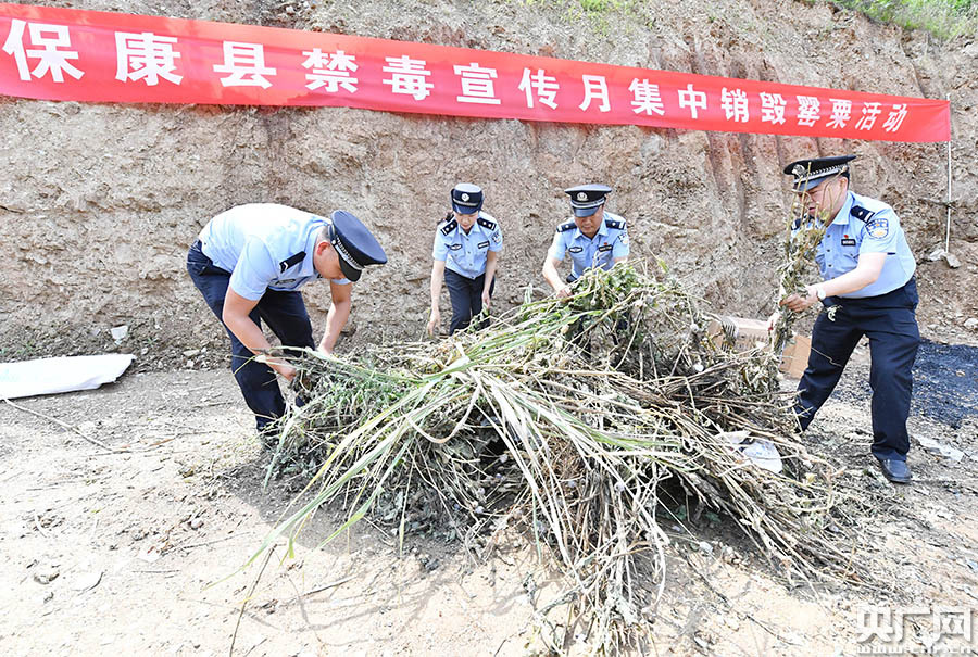 6月19日,湖北省?悼h公安局禁毒大隊在該縣垃圾處理廠開展集中銷毀罌粟活動,民警對今年查獲的2424株罌粟進行了點火焚燒,警示人們遠離毒品,珍愛生命。