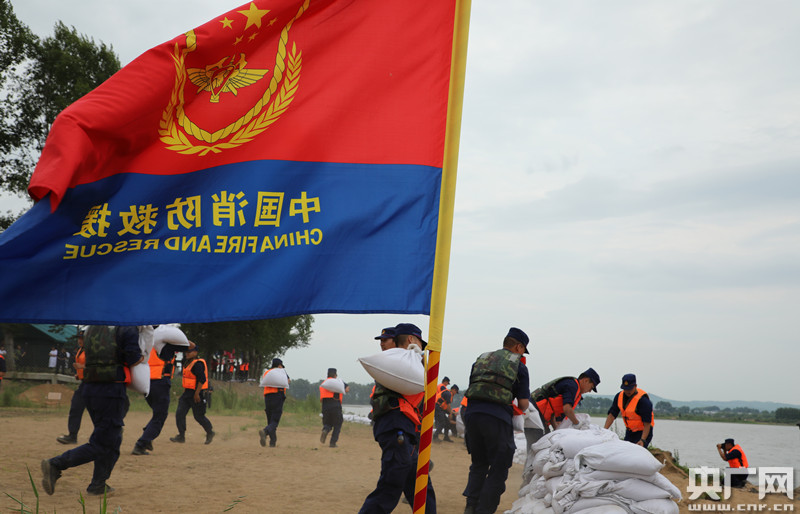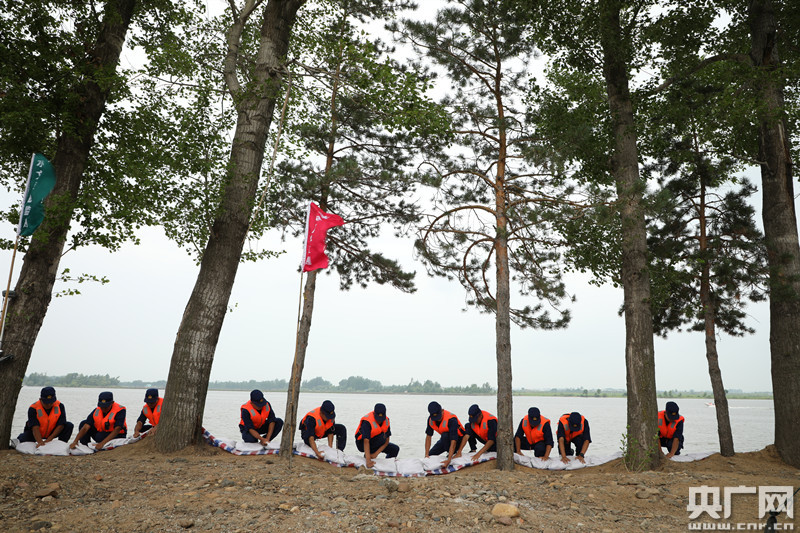 參演指戰(zhàn)員正在用沙袋構(gòu)筑堤壩(央廣網(wǎng)發(fā) 黑龍江省森林消防總隊供圖)
