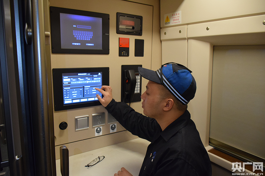 徐海洋正在復(fù)興號監(jiān)控室測試旅客服務(wù)信息系統(tǒng)播報情況(央廣網(wǎng)發(fā) 萬新 攝)