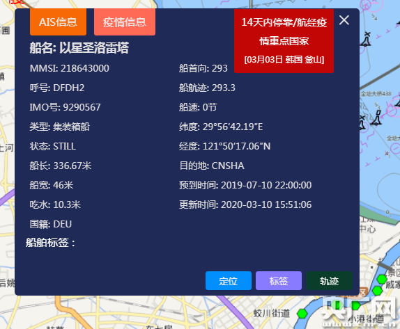 3月10日,剛剛提交進(jìn)港申請(qǐng)的“以星圣洛塔”輪,因系統(tǒng)匹配到它在7天前曾經(jīng)靠泊某疫情嚴(yán)重國(guó)家港口,觸發(fā)了“紅碼”提醒。在核對(duì)了相應(yīng)信息后,寧波海事局第一時(shí)間要求做好船員體溫檢測(cè)、控制人員登離,妥善處理船舶產(chǎn)生的生活垃圾和污水,同時(shí)將相關(guān)信息通報(bào)引航、港口調(diào)度、船舶代理公司等單位,落實(shí)相應(yīng)防范措施。