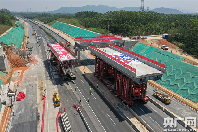 央廣網(wǎng)廣州5月10日消息(記者郭翔宇 通訊員粵交綜)在開陽高速北慣至奕洞段的天橋施工現(xiàn)場,14組智能模塊車快速往返作業(yè)。3個多小時后,3座舊天橋被拆除,1座新的天橋被迅速搭建起來……這是全國首個采用SPMT模塊智能移運技術(shù)同步拆建天橋的高速公路改擴建項目。