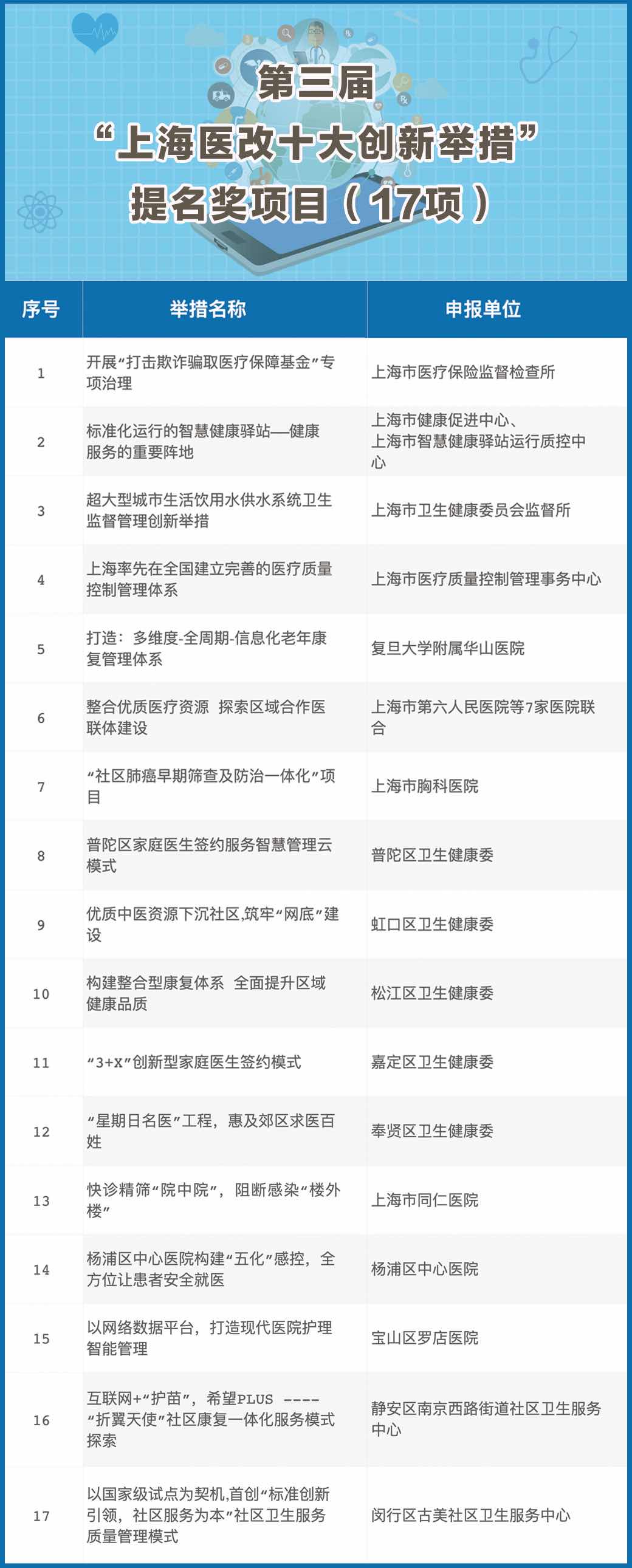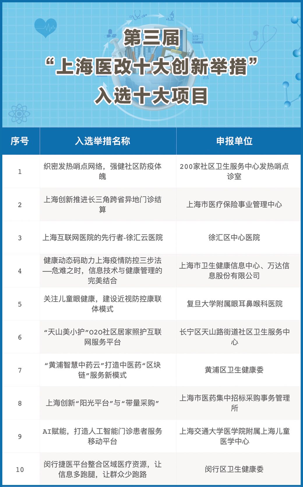 今年的評選活動正值抗疫期間,但社會反響依舊熱烈,共收到辦醫(yī)主體、醫(yī)療衛(wèi)生機構(gòu)和市級衛(wèi)生計生相關(guān)學(xué)會(協(xié)會)等推薦申報的58條舉措。經(jīng)過專家嚴(yán)格遴選,產(chǎn)生了27條入圍舉措,并通過“健康上海12320”官方微信接受市民投票。日前,第三屆“上海醫(yī)改十大創(chuàng)新舉措”評選結(jié)果正式出爐,現(xiàn)向社會公布。這些獲獎、入圍舉措引起社會強烈反響,全方位展示了上海醫(yī)改的突破性進展和積極成效,為上海、長三角乃至全國居民就醫(yī)帶來了實實在在的獲得感、幸福感。
