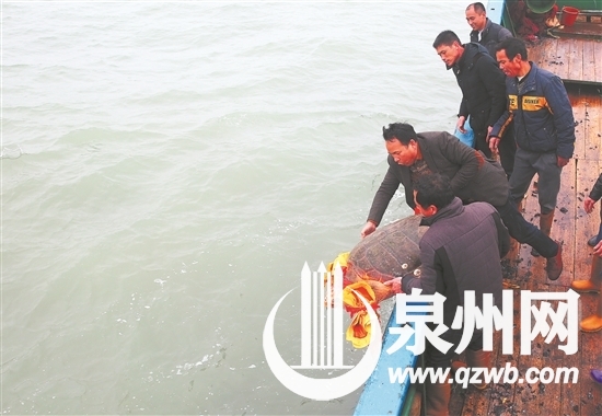 昨日下午3點(diǎn)多,記者隨同李阿尾、惠安縣海洋與漁業(yè)局工作人員搭上小泡沫船,再轉(zhuǎn)乘大漁船離開前峰碼頭。下午3點(diǎn)50分,一行人將海龜抱起,放回大海;莅部h海洋與漁業(yè)局漁政股負(fù)責(zé)人梁偉斌說,在當(dāng)?shù)匾粠ШS虿兜饺绱舜蟮摹疤窖篼慅敗,較為少見。他提醒,漁民誤捕海龜應(yīng)立即將它放回大海,如果對(duì)龜?shù)姆N類不明確,應(yīng)及時(shí)通知海洋與漁業(yè)等部門前來處理。