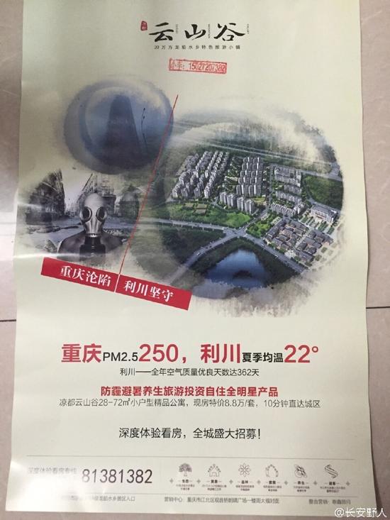 昨天中午,實(shí)名認(rèn)證為@@重慶市渝中區(qū)巴渝公益事業(yè)發(fā)展中心主任鄭建的網(wǎng)友,在微博上貼出一張利川一個(gè)樓盤的廣告單照片,頁面中心處“重慶淪陷,利川堅(jiān)守”八個(gè)字非常醒目,八個(gè)字下面還寫著“重慶PM2.5 250,利川夏季均溫22℃,利川全年空氣質(zhì)量?jī)?yōu)良天數(shù)達(dá)362天”。其中,“重慶”和“250”的字體明顯放大,并改用更醒目的紅色。