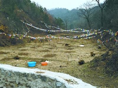 根據(jù)其他村民的指點(diǎn),記者和王云芳在一處山溝里找到了放生點(diǎn)。這里的山溝中掛有大量彩色旗幟,有的旗幟上畫有圖案,有的上面寫有看不懂的文字。附近至少有15只狐貍和貉在四處游蕩,在吃人們投放的白面饅頭和胡蘿卜。