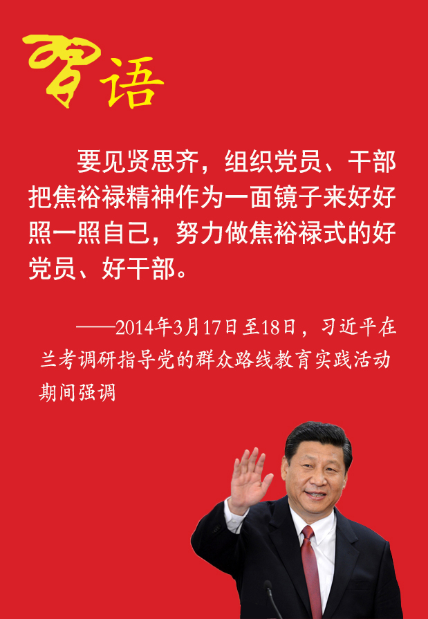 2014年3月17日至18日,習(xí)近平在蘭考調(diào)研指導(dǎo)黨的群眾路線教育實(shí)踐活動(dòng)期間要求:“要見賢思齊,組織黨員、干部把焦裕祿精神作為一面鏡子來好好照一照自己,努力做焦裕祿式的好黨員、好干部。”