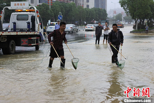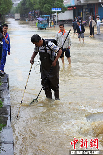 5月8日,湖南省永州市道縣再遭大暴雨襲擊,縣城多處低洼處被水淹,農(nóng)作物、水產(chǎn)養(yǎng)殖損失嚴重,不少民眾拿起漁具到被淹沒的馬路上捕魚。目前,道縣搶險、核災和災后自救工作已全面有序展開。
