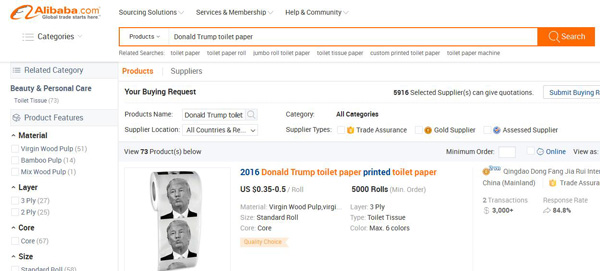 在阿里巴巴國際站輸入“特朗普廁紙”后的結(jié)果