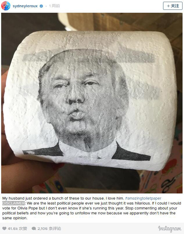 特朗普廁紙大賣,訂單是希拉里廁紙的6倍(圖)