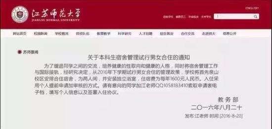 這條《關(guān)于本科生宿舍管理試行男女合住的通知》稱,從2016年下學(xué)期試行男女合住的管理政策,學(xué)校將首先泉山校區(qū)安排合住宿舍,為兩人間,并安裝獨(dú)立浴室,住宿費(fèi)為每年1600元。