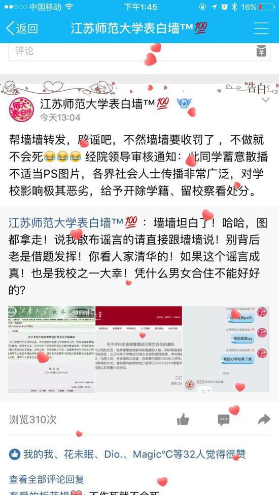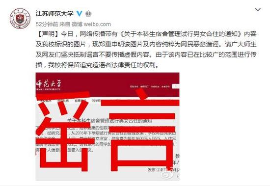 現(xiàn)代快報訊(記者 李偉豪)8月20日上午,一條截圖在微信朋友圈迅速傳開。截圖顯示是江蘇師范大學(xué)官網(wǎng)發(fā)布的一條通知,通知稱校方共2016年第二學(xué)期開始,可以申請男女合住。不過,很快,該校便通過官方微博辟謠,表示此為惡意造謠,保留追究造謠者發(fā)了責(zé)任的權(quán)利。