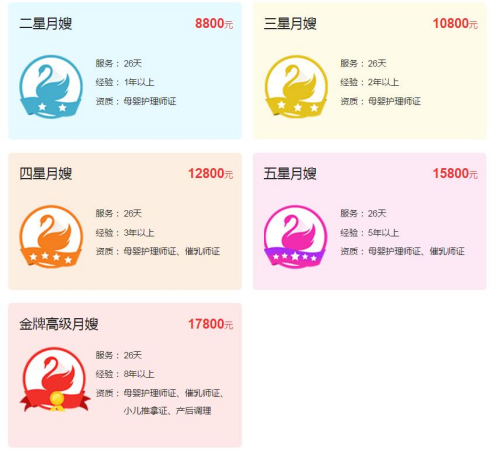 一家生活服務(wù)平臺公開的月嫂價格顯示,在北京提供26天服務(wù),二星月嫂需要8800元,三星月嫂10800元,四星月嫂12800元,五星月嫂15800元,最高級別的金牌高級月嫂則要17800元。