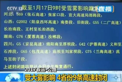 受大霧和降雪的影響,截至今天上午9點,全國4省市9條高速路段封閉。包括河北張石公路張家口段、宣大高速局部路段;山西陽泉西環(huán)高速南婁段、舊街段,二廣高速長治南段;湖南蓉廈高速汝郴段;四川京昆高速、滬蓉高速、包茂高速、蘭海高速的部分路段。