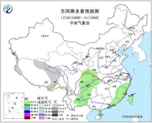 29日08時(shí)至30日08時(shí),西藏西部、南疆西部、黃淮大部、東北地區(qū)東部等地有小到中雪或雨夾雪,吉林東部的局地有大雪;西南地區(qū)東部、江漢大部、江淮、江南西部和東部、華南東部等地有小雨,局地中雨。內(nèi)蒙古中西部、東北地區(qū)中南部、華北、黃淮、江淮等地有4~6級(jí)風(fēng)(見圖2)。渤海、黃海、東海有7~8級(jí)、陣風(fēng)9級(jí)的偏北或東北風(fēng)。