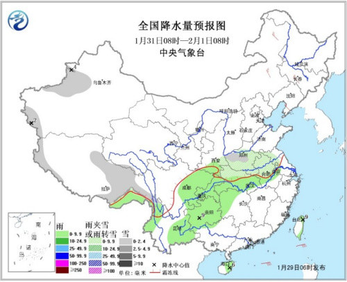 1月31日08時(shí)至2月1日08時(shí),新疆西部、西藏西部和東部、黃淮西部、江漢北部、江淮中北部、陜西東南部等地有小到中雪或雨夾雪;西南地區(qū)東部、江漢南部、江南西北部、云南東部和西北部、陜西南部、海南島東部等地有小雨或陣雨。內(nèi)蒙古中東部、東北地區(qū)中南部等地有4~6級(jí)偏北風(fēng)(見圖4)。臺(tái)灣海峽、臺(tái)灣東南洋面、南海東北部有7~8級(jí)、陣風(fēng)9~10級(jí)的東北風(fēng)。