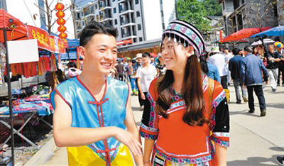 2016年8月14日,在湖北省恩施市紅土鄉(xiāng)石窯集鎮(zhèn)上,土家族男女青年正在趕場相親。