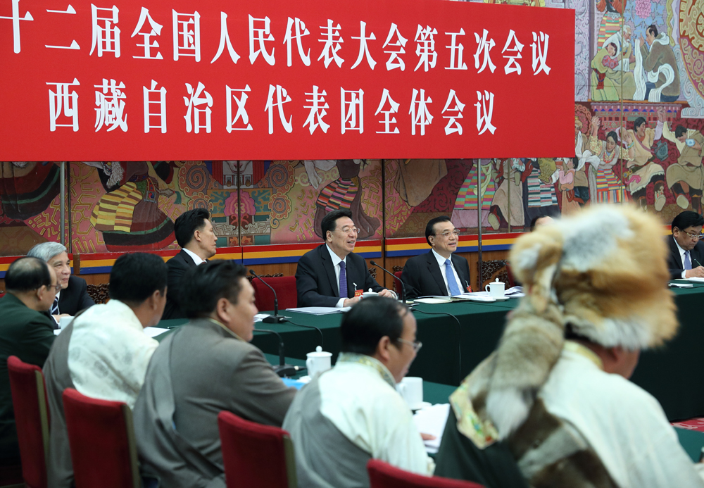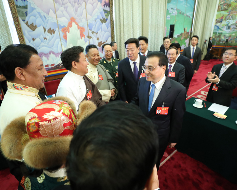 國際在線消息(記者 翟磊):李克強總理7日上午來到十二屆全國人大五次會議西藏代表團,參加審議政府工作報告。五位藏族、珞巴族、門巴族代表向總理獻上潔白的哈達。 -