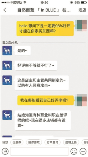 一家名為“自然而藍”的店鋪主營服裝類商品,北青報記者以顧客身份進行詢問,客服稱,買家發(fā)出的好評率要在98%以上,才可以在店中購買!昂迷u率不夠就不行了,這也是店主和主管共同制定的,以防有人惡意攻擊!笨头藛T稱,目前有很多家店鋪都有類似設置,“因為有種行當叫職業(yè)差評師,所以很多家店鋪都會設置,只是標準不一樣,算是不成文的規(guī)矩!