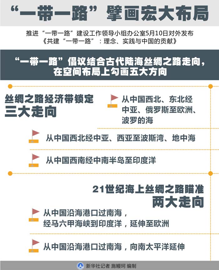 循著絲路上的聲聲駝鈴與碧海中的帆檣舟楫,“一帶一路”倡議結(jié)合古代陸海絲綢之路走向,在空間布局上勾畫(huà)五大方向。