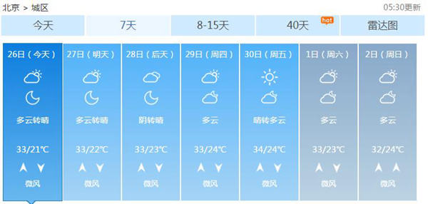 未來一周大部分時(shí)間北京都會(huì)以晴到多云天氣為主,天氣炎熱,最高溫可達(dá)33-34℃,最低溫在21-24℃之間,但今天至28日午后到傍晚西部、北部多分散性雷陣雨天氣,提醒大家注意防范。
