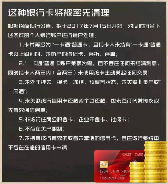 這張卡為普通卡且賬戶余額為零,且不存在任何未結清利息,持卡人兩年內(nèi)(含兩年)未使用該卡主動發(fā)起任何交易;這張普通卡沒有關聯(lián)招行的信用卡還款或個人貸款還款,也不是工資卡、住房公積金卡、企業(yè)年金卡、社?ǖ。