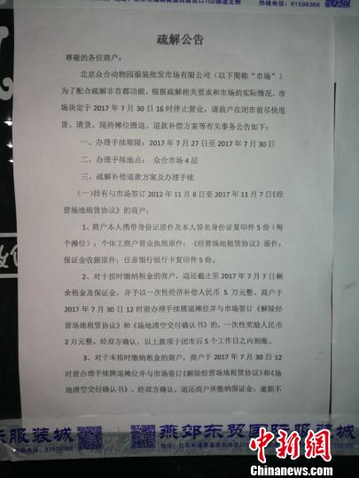 北京“動批”眾合市場26日貼出正式疏解公告。圖為疏解公告。公告中稱,市場于2017年7月30日16時停止?fàn)I業(yè)。 曾鼐 攝