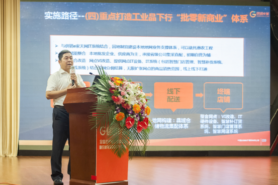 作為本次論壇的主辦方之一,中國供銷電子商務有限公司常務副總經(jīng)理戴海濤,做了題為《發(fā)揮供銷社優(yōu)勢,構(gòu)建農(nóng)村電商新格局》的專題報告。在報告中,戴總以供銷e家業(yè)務定位及商業(yè)模式為例,向與會人員詳細介紹了供銷e家關于打造縣域“新商業(yè)”體系的一些成功經(jīng)驗,并匯報了平臺上線后取得業(yè)績:截至今年上半年,“供銷e家”已累計建設各級運營中心224個,村級綜合服務網(wǎng)點突破23,000個,全國申請批復的地方運營平臺326個,其中在線運營PC端184個、APP端132個,在線商品逾7萬,全國注冊會員逾300萬,全系統(tǒng)銷售規(guī)模突破36億,預計全年實現(xiàn)80億,供銷e家已經(jīng)成為推動農(nóng)村發(fā)展農(nóng)民增收的中堅力量。在介紹縣域“新商業(yè)”體系時,戴總重點解讀了聚焦農(nóng)產(chǎn)品上行和工業(yè)品下行,天網(wǎng)地網(wǎng)雙網(wǎng)支撐,兩端拉動樹品牌、引流量、做營銷賦能整合,構(gòu)建監(jiān)督管理體系、數(shù)據(jù)共享體系等供銷e家最核心的商務項目和運營模式。