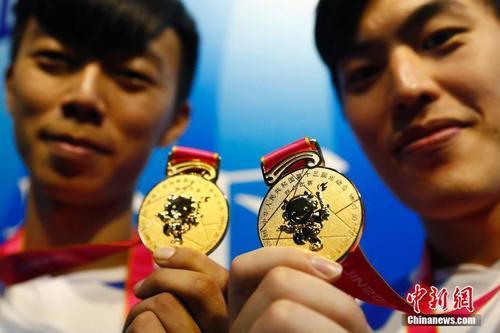 天津全運會羽毛球群眾比賽男雙A組,中國臺灣地區(qū)組合何致穎(右)、王翔羿奪得冠軍。 中新社記者 富田 攝