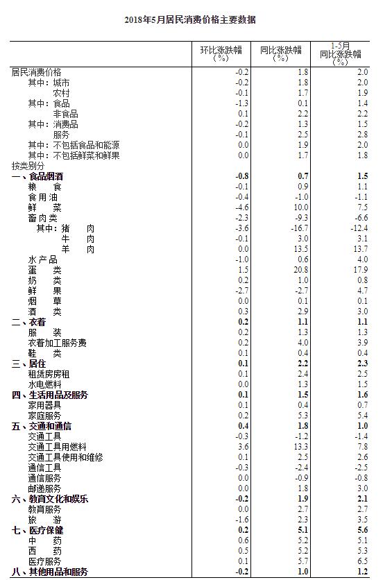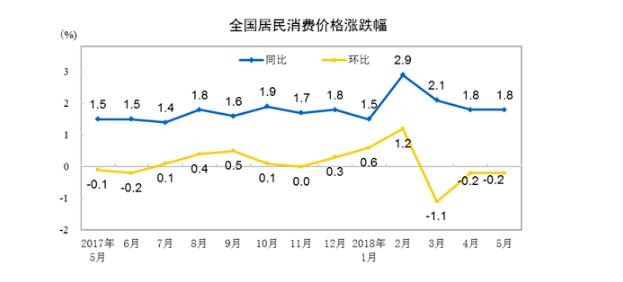 2018年5月份,全國居民消費(fèi)價格同比上漲1.8%。其中,城市上漲1.8%,農(nóng)村上漲1.7%;食品價格上漲0.1%,非食品價格上漲2.2%;消費(fèi)品價格上漲1.3%,服務(wù)價格上漲2.5%。1-5月平均,全國居民消費(fèi)價格比去年同期上漲2.0%。