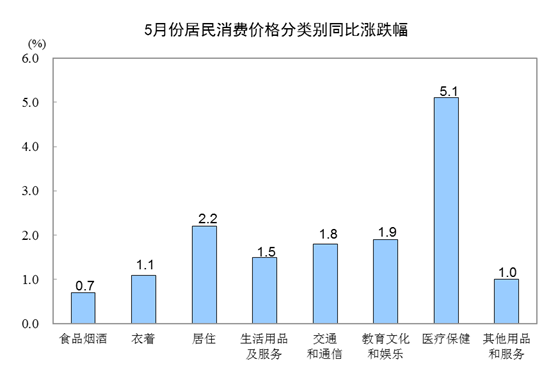 其他七大類價格同比均上漲。其中,醫(yī)療保健、居住、教育文化和娛樂價格分別上漲5.1%、2.2%和1.9%,交通和通信、生活用品及服務(wù)價格分別上漲1.8%和1.5%,衣著、其他用品和服務(wù)價格分別上漲1.1%和1.0%。