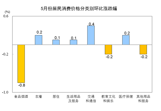 5月份,全國居民消費(fèi)價格環(huán)比下降0.2%。其中,城市下降0.2%,農(nóng)村下降0.1%;食品價格下降1.3%,非食品價格上漲0.1%;消費(fèi)品價格下降0.2%,服務(wù)價格下降0.1%。