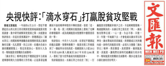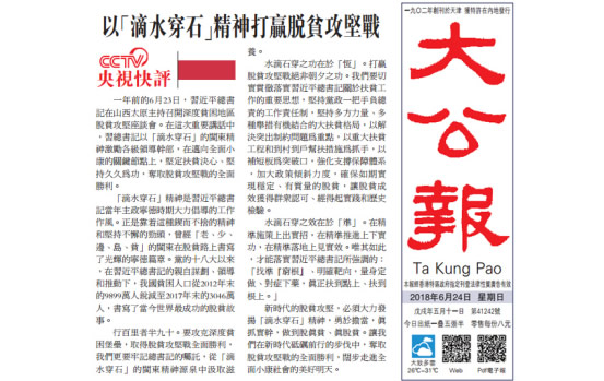 央視網(wǎng)消息:6月24日,香港《文匯報(bào)》和香港《大公報(bào)》同時(shí)轉(zhuǎn)發(fā)了中央廣播電視總臺(tái)央視新聞刊播的《央視快評(píng)》。文章指出,一年前的6月23日,習(xí)近平總書(shū)記在山西太原主持召開(kāi)深度貧困地區(qū)脫貧攻堅(jiān)座談會(huì),集中研究破解深度貧困之策。在這次重要講話中,習(xí)總書(shū)記以“滴水穿石”的閩東精神激勵(lì)各級(jí)領(lǐng)導(dǎo)干部真正做到胸有宏圖、扎扎實(shí)實(shí)、持之以恒,在邁向全面小康的關(guān)鍵節(jié)點(diǎn)上,堅(jiān)定扶貧決心、堅(jiān)持久久為功,奪取脫貧攻堅(jiān)戰(zhàn)的全面勝利。報(bào)道內(nèi)容如下: