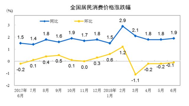2018年6月份,全國居民消費(fèi)價(jià)格同比上漲1.9%。其中,城市上漲1.8%,農(nóng)村上漲1.9%;食品價(jià)格上漲0.3%,非食品價(jià)格上漲2.2%;消費(fèi)品價(jià)格上漲1.5%,服務(wù)價(jià)格上漲2.4%。上半年,全國居民消費(fèi)價(jià)格比去年同期上漲2.0%。