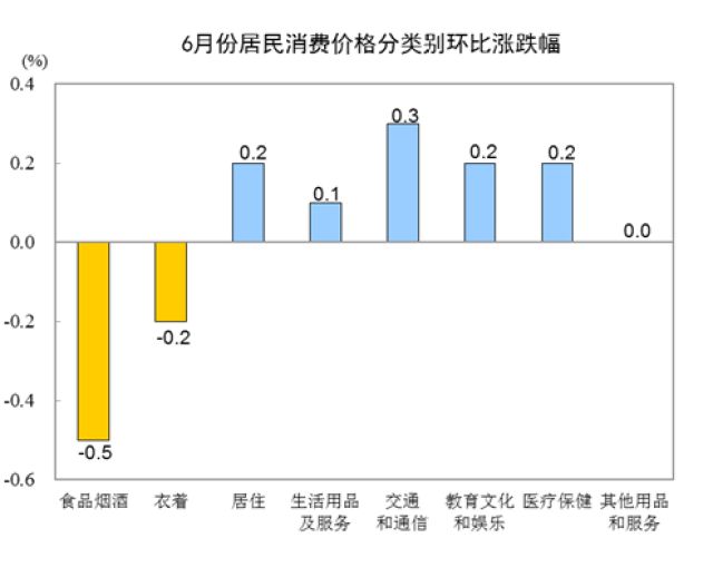6月份,全國居民消費(fèi)價(jià)格環(huán)比下降0.1%。其中,城市持平,農(nóng)村下降0.1%;食品價(jià)格下降0.8%,非食品價(jià)格上漲0.1%;消費(fèi)品價(jià)格下降0.2%,服務(wù)價(jià)格上漲0.2%。