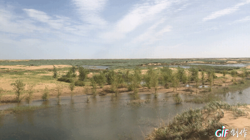 走進(jìn)位于鄂爾多斯市杭錦旗呼和木獨(dú)鎮(zhèn)巴音溫都爾嘎查的庫布其沙漠水生態(tài)治理區(qū),分布在沙漠中大大小小的水潭在烈日下閃閃發(fā)光,蘆葦蕩隨風(fēng)起伏,牛和駱駝?dòng)崎e漫步其中。但在幾年前,這里還是毫無生機(jī)的不毛沙地。