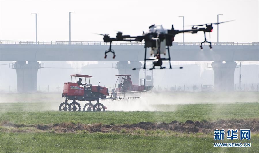 3月16日,在湖北省襄陽(yáng)市襄州區(qū)的10萬(wàn)畝小麥綠色高質(zhì)高效示范區(qū),農(nóng)業(yè)技術(shù)推廣人員進(jìn)行病蟲(chóng)害機(jī)械化綠色綜合防控作業(yè)。新華社記者 肖藝九 攝