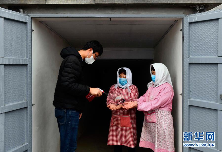 2月14日,在山東省濰坊市寒亭區(qū)國(guó)家現(xiàn)代農(nóng)業(yè)產(chǎn)業(yè)園,濰坊郭牌農(nóng)業(yè)公司工作人員進(jìn)入溫室大棚前接受手部消毒。新華社記者 郭緒雷 攝