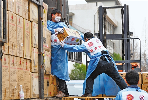 3月3日,武漢市青山區(qū)武糧倉(cāng)庫(kù),志愿者在搬運(yùn)捐贈(zèng)的水果等物資。經(jīng)濟(jì)日?qǐng)?bào)-中國(guó)經(jīng)濟(jì)網(wǎng)記者 高興貴攝
